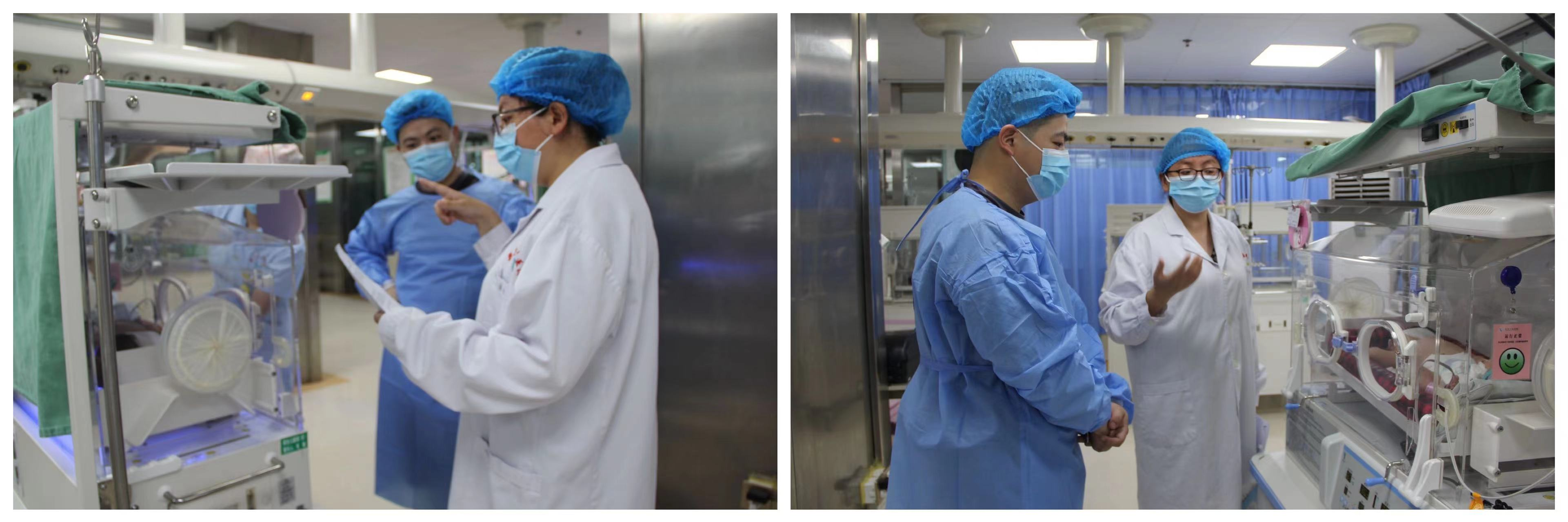 由于某种原因,有些宝宝出生就住进了称为“暖箱”的小房子,家人往往不能陪伴,宝妈、宝爸常常有焦虑、担忧的情绪。为体现人文关怀,增进亲子互动,在做好无菌防护的前提下,邀请宝爸、宝妈进入监护室近距离接触宝宝,或视频联系宝妈、宝爸观看宝宝成长情况,以解决未能亲临现场的遗憾。医护人员给宝妈宝爸介绍宝宝成长、健康情况,一对一指导家长人工喂养的技巧及注意事项,示范“婴儿抚触法”“排气操”“脐部护理”等新生儿护理方法。
