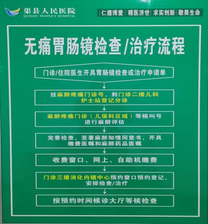 为切实保障患者生命健康安全,规范操作流程,增加麻醉评估流程。如下:门诊或住院医生开具无痛胃肠镜检查申请并完善相关术前检查;患者挂麻醉疼痛门诊号,执相关检查报告到麻醉疼痛门诊(二楼儿保科区域)进行麻醉前评估,麻醉评估通过后,开具麻醉药品和缴费医嘱,并签署麻醉知情同意书;患者缴费后到门诊三楼消化内镜中心预约,按照预约时间到内镜中心完成无痛肠胃肠镜检查。(具体流程见下图)。