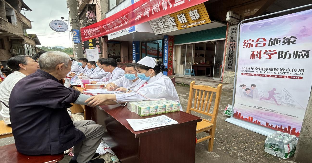 防癌宣教,提高认识。组织多位科室主任及高资历医师带领的13人医疗团队,在渠县三汇镇向阳社区开展了“综合施策、科学防癌”义诊活动。通过现场诊治、咨询答疑等形式,为群众提供肿瘤预防、筛查及慢性病知识的宣讲,并现场测量血压、发放防癌手册。共计服务群众600余人次,发放防癌手册400余,活动有效提升了居民的防癌意识和健康知识,受到广泛好评。