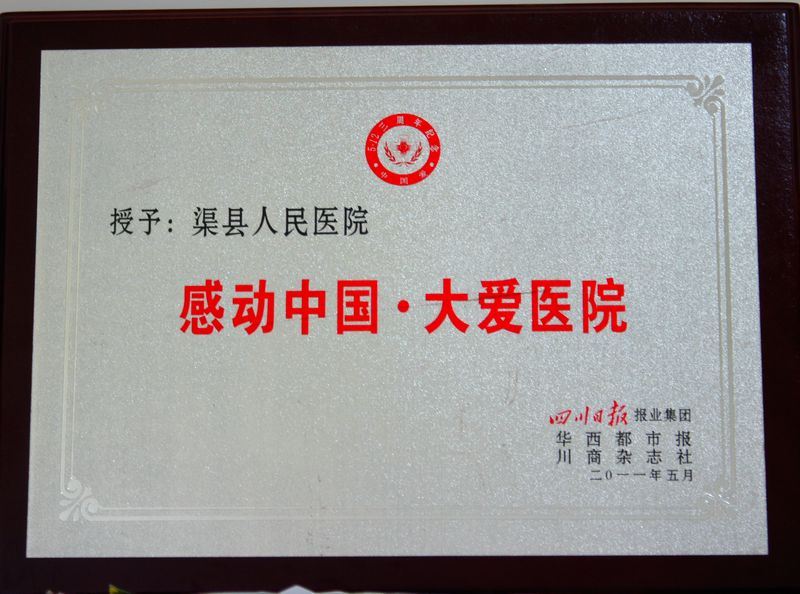 在此次感恩“生命使者”先进事迹报告会上同时还宣读了由广大读者、网友、专家和新闻工作者推选的“感动中国·白衣天使”、“感动中国·生命使者”、“感动中国·大爱医院”的获奖名单,渠县人民医院荣获了“感动中国·大爱医院”光荣称号。