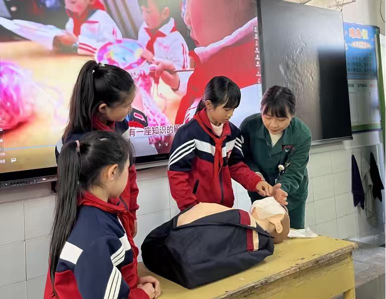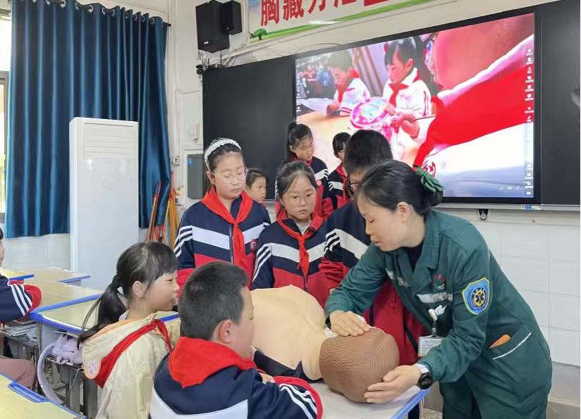 心肺复苏互动演练环节深受学生欢迎。在急诊科护士长罗媛带领下,多名医护人员将模拟人带入操场,手把手指导学生进行胸外按压、人工呼吸等实操训练。孩子们在医护人员耐心指导下认真模仿、反复练习,在沉浸式体验中掌握了基本急救技能。